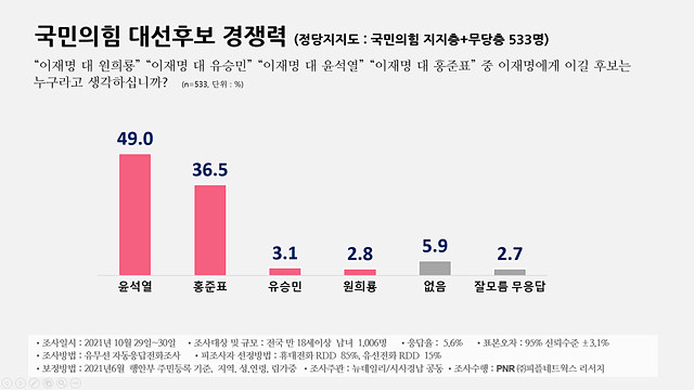 뉴스핌 여론조사 국민의힘 대선후보 적합도 홍준표 32 4 Vs 윤석열 28 8